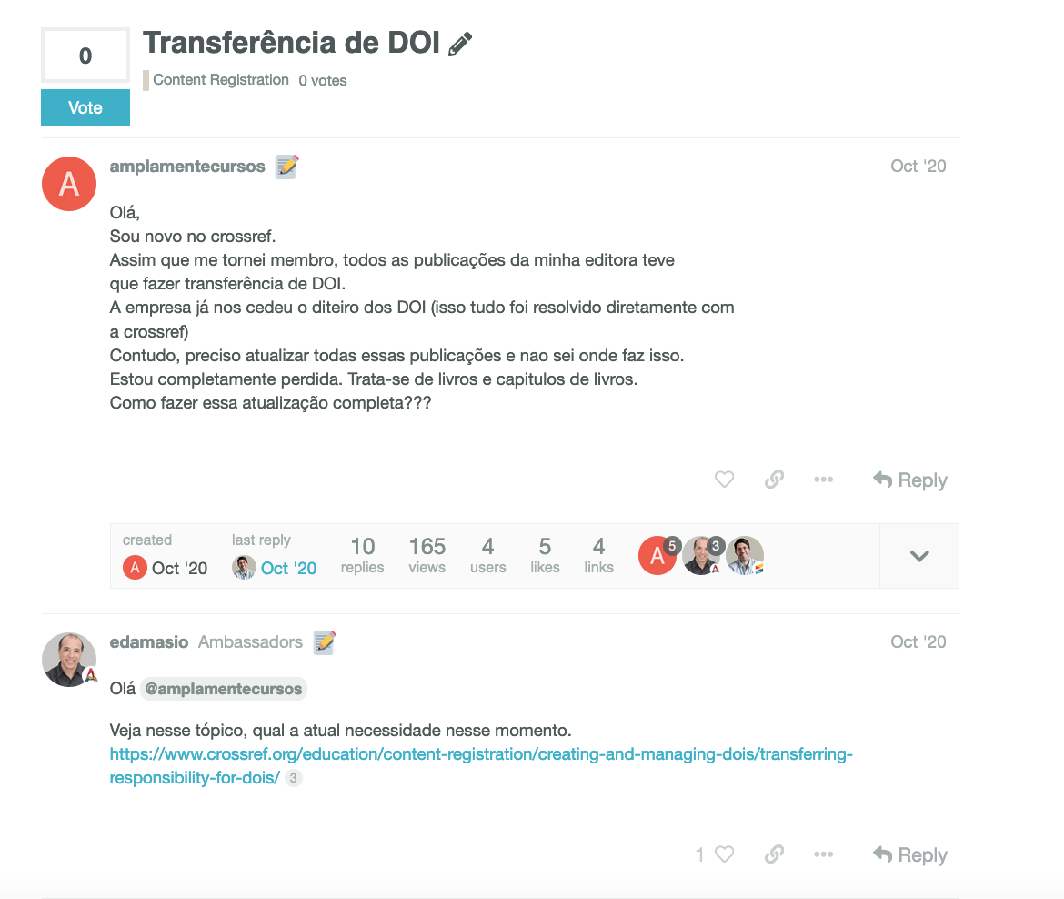 Hosted on the open-source discussion platform Discourse, you can find our forum at community.crossref.org. The goal of the community forum is to create an inclusive, open space where Crossref members, ambassadors, sponsors, service providers, and others who share a passion for scholarly infrastructure, can connect. This enables collaborative problem-solving, the sharing of expertise and experiences across time zones and languages, and allows members to post questions to be answered by other community members or even our staff. Members of the community engage via creating posts, commenting on existing content in the forum, volunteering for working groups or beta-testing projects, helping to co-create materials that include translations and shared FAQs, giving feedback on new developments, and joining online events and webinars. Throughout these interactions, we expect that those who use the community forum will form relationships –– a collective working together to advance their work with Crossref and shape the future of scholarly infrastructure.