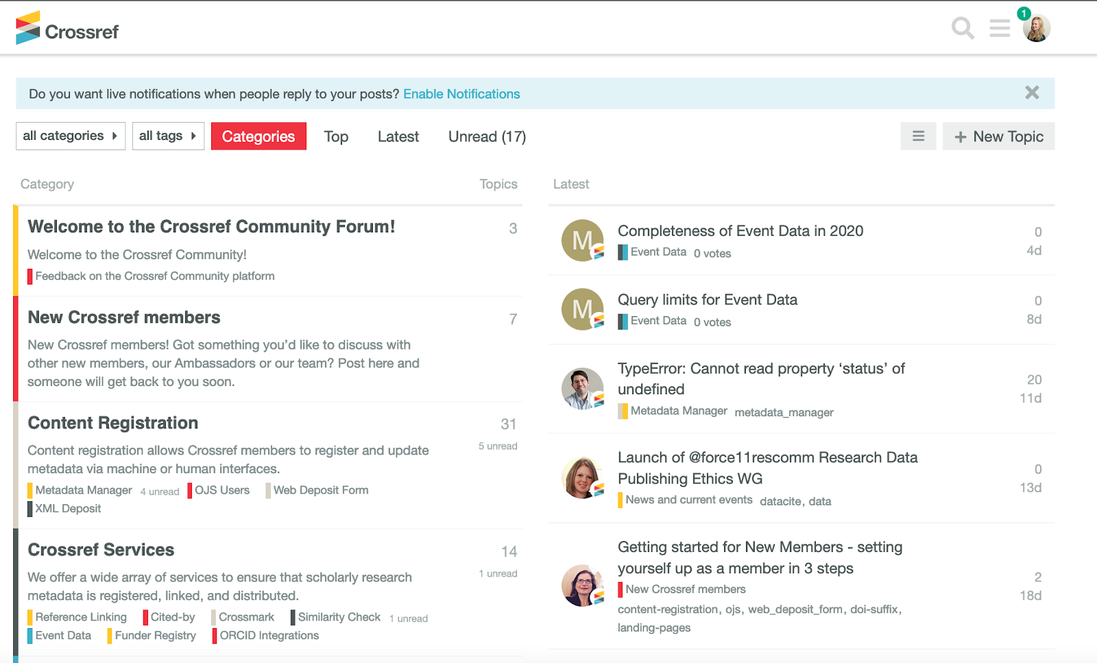 Do you have a question about registering or updating your metadata? Then head over to the Content Registration category and post your query to the group. Want to find out about getting started with Similarity Check service? Then take a look at our Similarity Check topic in our services category. Or maybe you want to know more about upcoming multilingual webinars at Crossref, or perhaps you have one of your own you’d like to share? Then check out the Community Calendar.