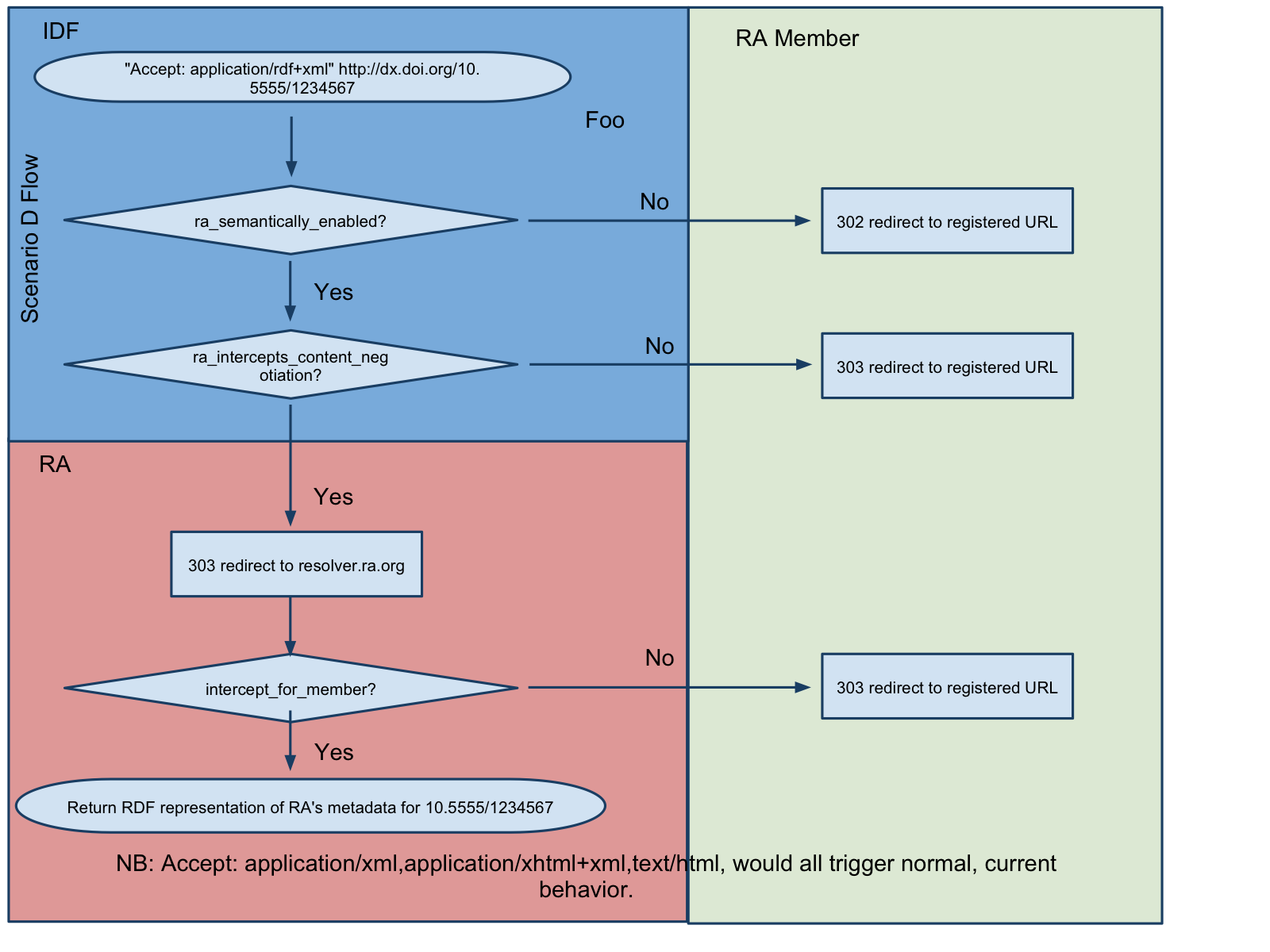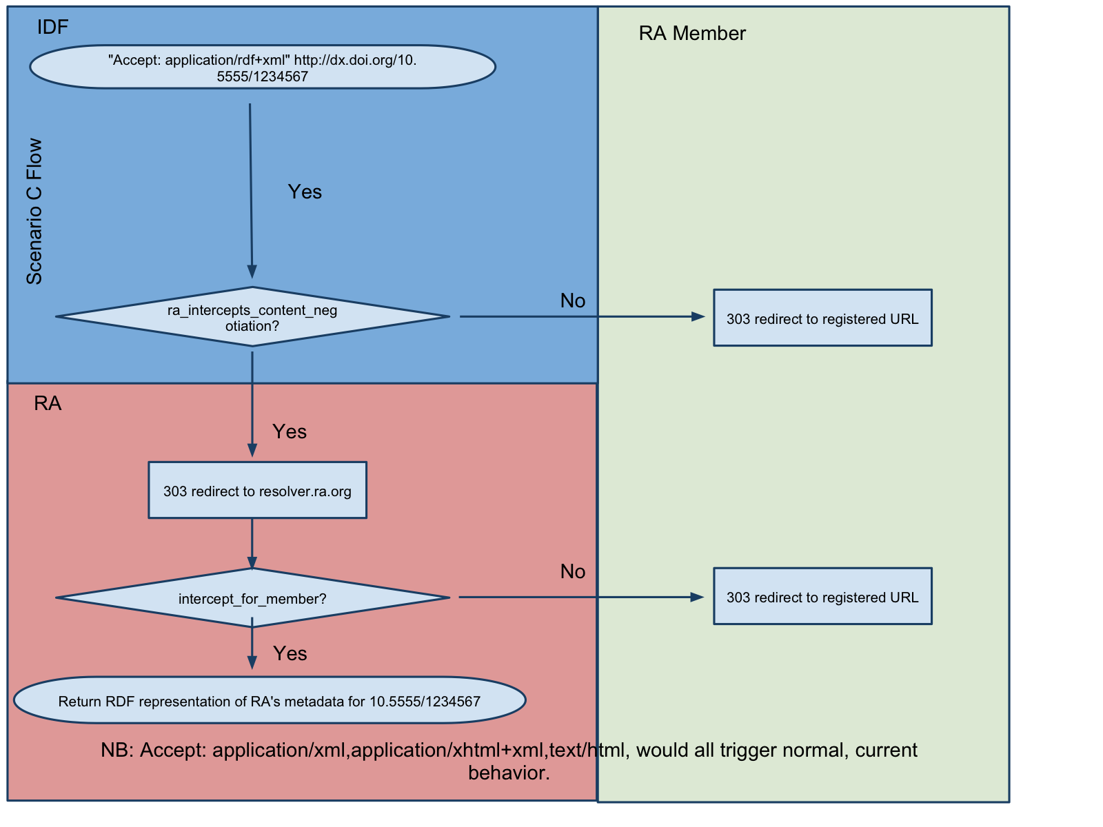 RA implements DOI resolver (e.g. dx.crossref.org) that supports content negotiation. RA allows its members to specify to the RA that they want either: <ol type=a>