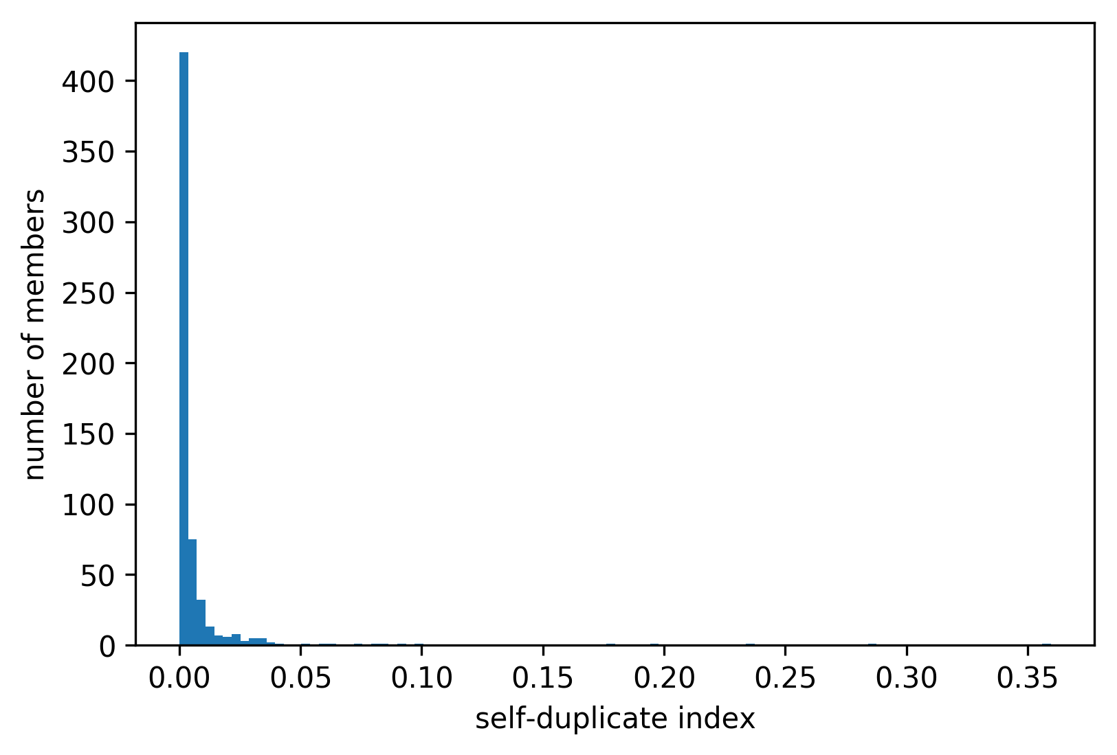 On average, members have a very small self-duplicate index of 0.67%. In addition, in the samples of 44% of analyzed members no self-duplicates were found. The histogram shows the skewness of the distribution: