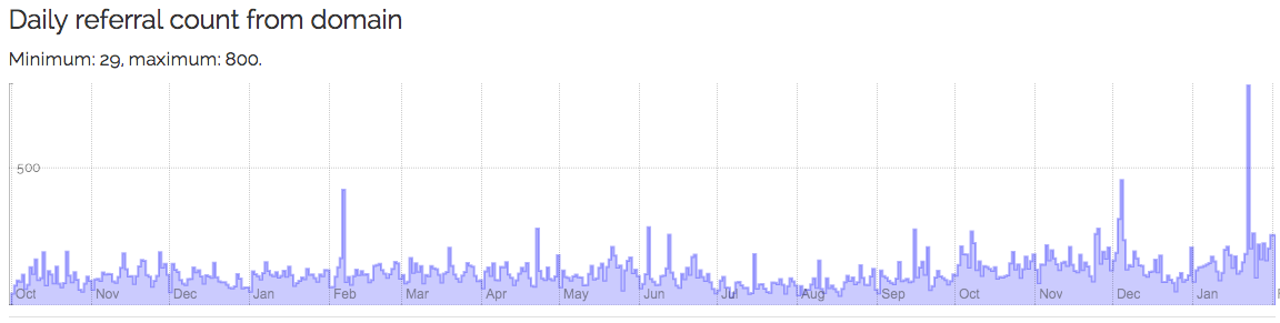 It’s a labs project so the usual weasel words apply. Specifically, we currently have the logs for 2012 to 2014 (we’re working at digging out the rest), and the referral information for 50 million DOIs (out of 71 million). That number will be higher by the time you read this. If your page is slow to load, be patient, as it’s currently working hard crunching numbers.