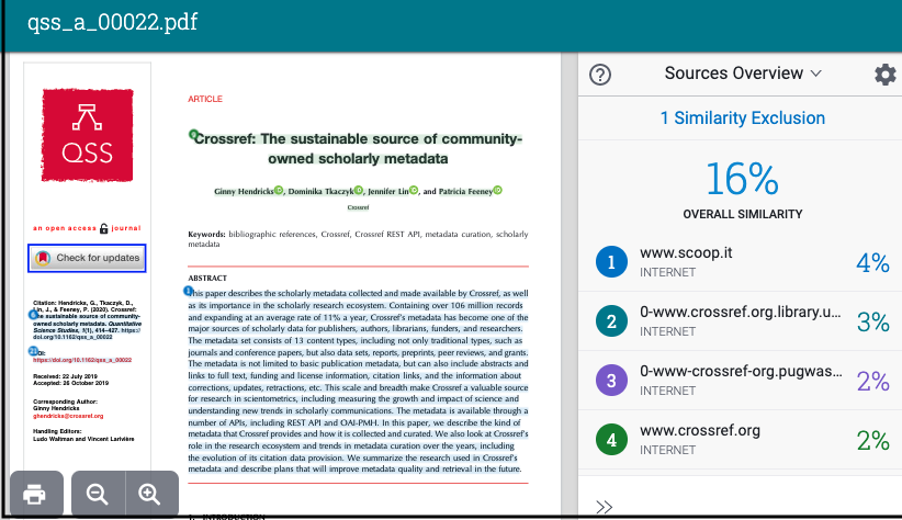 Crossref’s Similarity Check service is used by our members to detect text overlap with previously published work that may indicate plagiarism of scholarly or professional works. Manuscripts can be checked against millions of publications from other participating Crossref members and general web content using the iThenticate text comparison software from Turnitin.