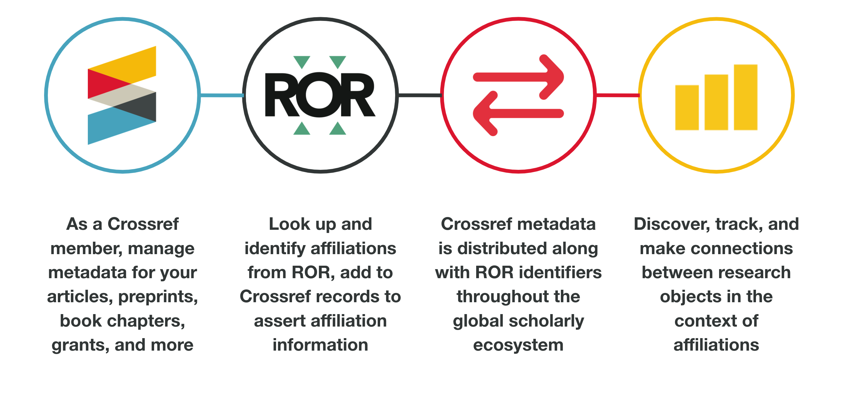 The inclusion of ROR in the Crossref metadata will help everyone in the scholarly ecosystem make critical connections more easily. For example, research institutions need to monitor and measure their output by the articles and other resources their researchers have produced. Journals need to know with which institutions authors are affiliated to determine eligibility for institutionally sponsored publishing agreements. Funders need to be able to discover and track the research and researchers they have supported. Academic librarians need to easily find all of the publications associated with their campus.